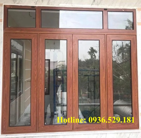 cửa đi chính 4 cánh nhôm Xingfa màu vân gỗ sang trọng, lắp đặt tại Bình Dương