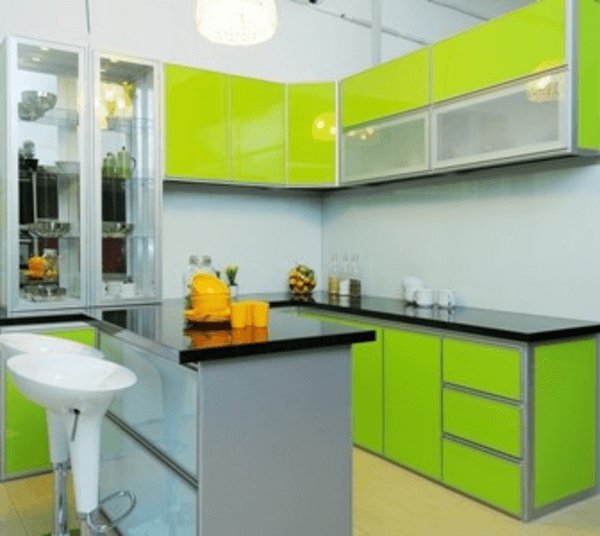 - Tủ bếp kính màu: Đây là loại tủ bếp đẹp, sang trọng và được nhiều người lựa chọn. Kính ốp màu thường sử dụng các màu đỏ, xanh biển, xanh lá, trắng sữa, xám ghi, màu trà, cam và vàng chanh.