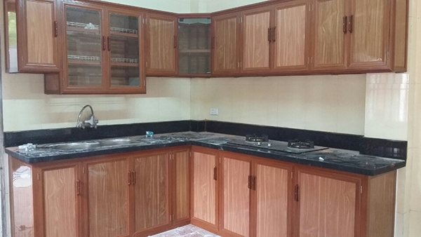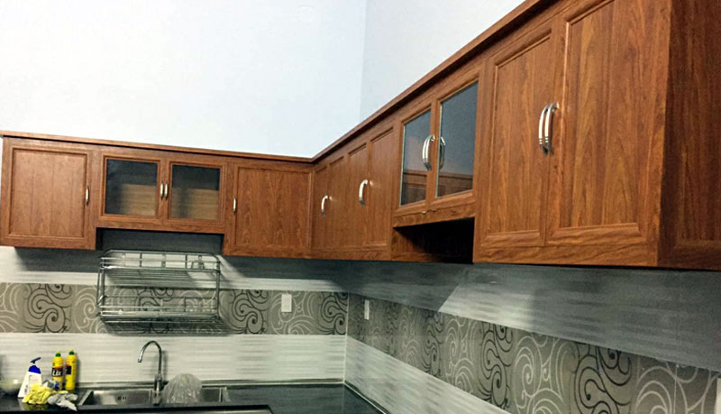4. Tủ bếp nhôm kính (bình dương) giả vân gỗ: Có 2 màu chủ đạo là nhạt và đỏ, phù hợp với nhiều mẫu thiết kế kiểu cổ điển và hiện đại.