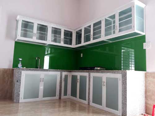 Tủ bếp có cánh kính màu, được làm từ nhôm hộp kích thước 25 x 38, dày 1li. Cánh tủ được ghép từ lá nhôm và có kính dày 4li, được sơn màu theo yêu cầu. Tủ bao gồm bản lề hơi giảm chấn inox 304 và tay nắm âm. Tủ đã được lắp đặt và hoàn thiện. |