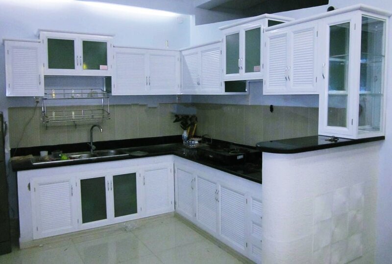 - Tủ bếp nhôm kính màu trắng sứ: Mẫu tủ này tạo cảm giác sạch sẽ và tinh tế cho không gian bếp.