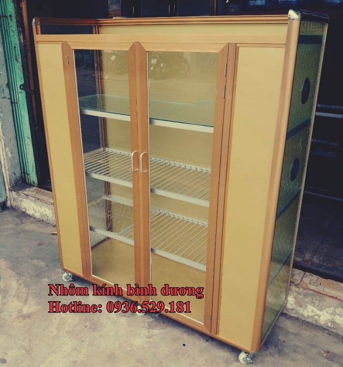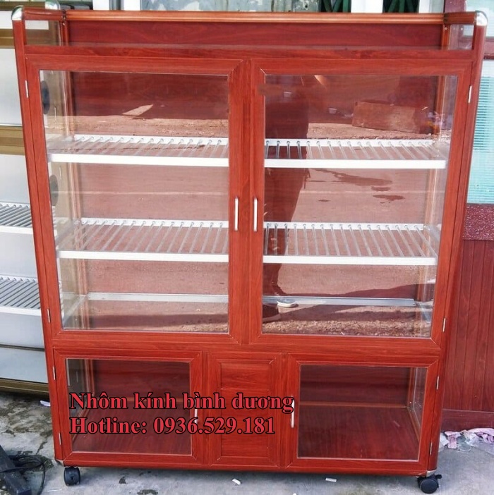 Tủ bếp nhôm kính bình dương màu vân gỗ: Làm tủ bếp, tủ chạn, tủ đựng bát đĩa, kệ bếp nhôm, chạn bếp,…Chiều dài tùy ý, chiều cao mặc định 60cm x sâu 35cm, cánh tủ bằng kính hoặc Alu vân gỗ |