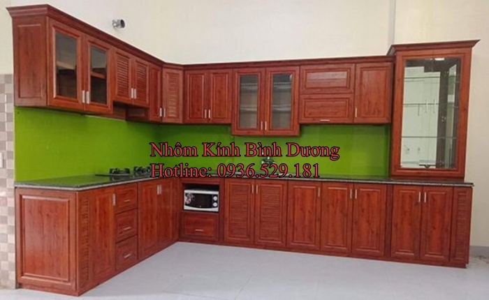 - Tủ bếp nhôm kính bình dương màu vân gỗ: Mẫu này mang lại vẻ sang trọng và hiện đại cho không gian bếp của bạn.