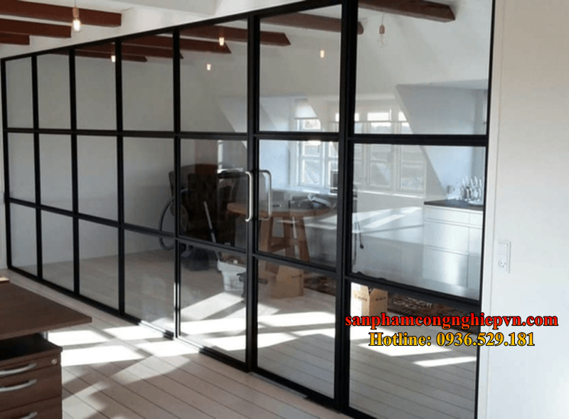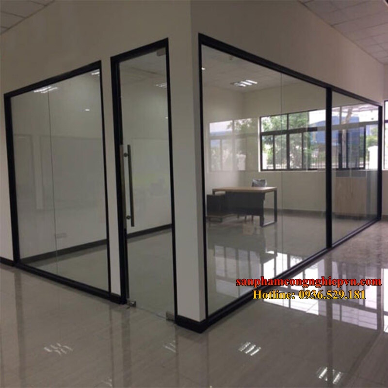 - Vách ngăn kính dán an toàn khung nhôm: An toàn hơn khi vỡ, cách âm tốt.